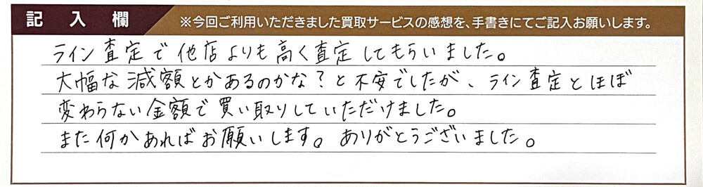 ライン査定で他店よりも高く査定してもらいました。 大幅な減額とかあるのかな?と不安でしたが、ライン査定とほぼ変わらない金額で買い取りしていただけました。 また何かあればお願いします。 ありがとうございました。