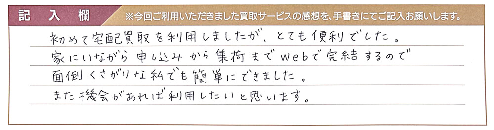 初めて宅配買取を利用しましたが、とても便利でした。 家にいながら申し込みから集荷までwebで完結するので、面倒くさがりな私でも簡単にできました。 また機会があれば利用したいと思います。
