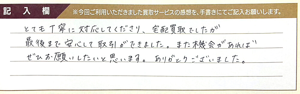 とても丁寧に対応してくださり、宅配買取でしたが最後まで安心して取引ができました。 また機会があればぜひお願いしたいと思います。 ありがとうございました。