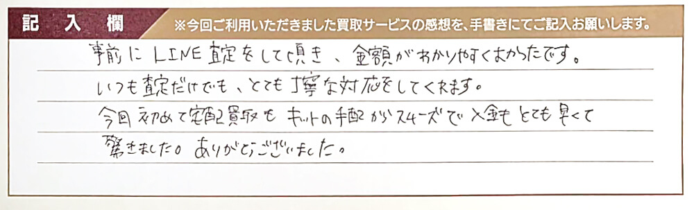 事前にLINE査定をして頂き、金額がわかりやすくよかったです。 いつも査定だけでも、とても丁寧な対応をしてくれます。 今回初めて宅配買取もキットの手配からスムーズで入金もとても早くて驚きました。 ありがとうございました。
