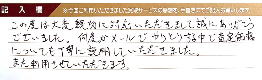 この度は大変親切に対応していただきまして誠にありがとうございました。 何度かメールでやりとりする中で査定価格についても丁寧に説明していただきました。 また利用させていただきます。