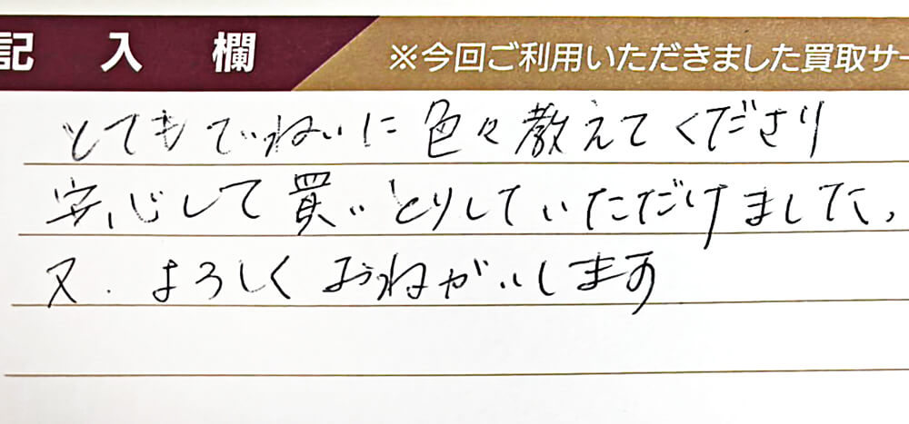 とてもていねいに色々教えてくださり安心して買いとりしていただけました。 又、よろしくおねがいします。