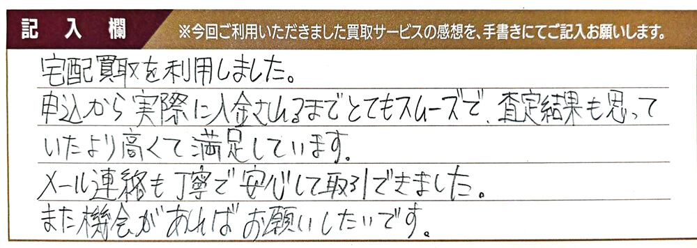 宅配買取を利用しました。 申込から実際に入金されるまでとてもスムーズで、査定結果も思っていたより高くて満足しています。 メール連絡も丁寧で安心して取引できました。 また機会があればお願いしたいです。
