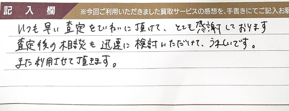 いつも早い査定をていねいに頂けて、とても感謝しております。 査定後の相談も迅速に検討いただけて、うれしいです。 また利用させて頂きます。