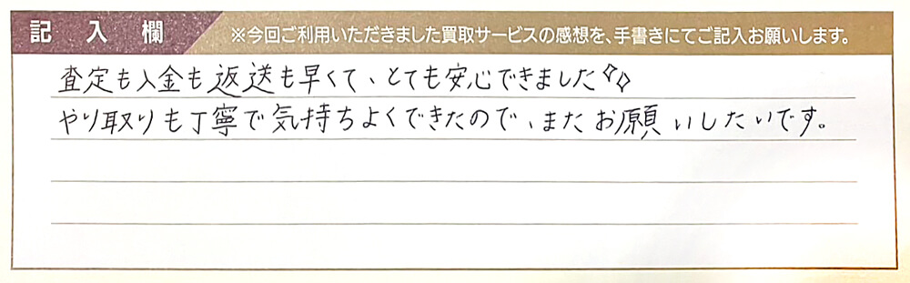 査定も入金も返送も早くて、とても安心できました。 やり取りも丁寧で気持ちよくできたので、またお願いしたいです。