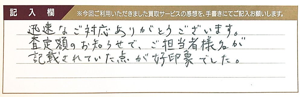 迅速なご対応ありがとうございます。 査定額のお知らせで、ご担当者様名が記載されていた点が好印象でした。