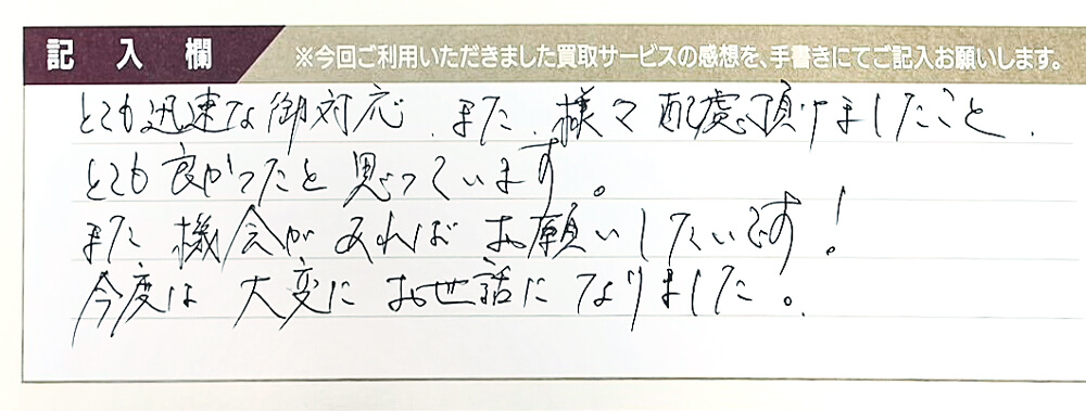 とても迅速な御対応、また様々配慮頂けましたこと、とても良かったと思っています。 また、機会があればお願いしたいです! 今度は大変にお世話になりました。