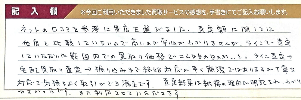 査定額に関しては他店と比較していないので高いのか安いのかわかりませんが、ラインで査定していただいた範囲内での買取り価格でこんなものなのか…と。
