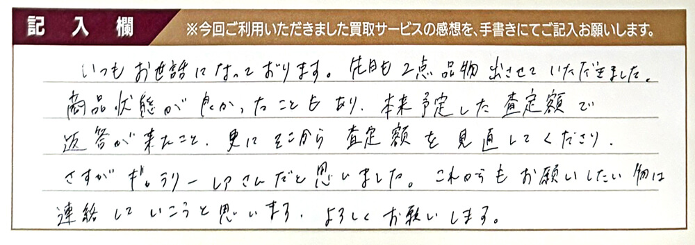 いつもお世話になっております。 先日も2点品物出させていただきました。 商品状態が良かったこともあり、本来予定した査定額で返答が来たこと、更にそこから査定額を見直してくださり、さすがギャラリーレアさんだと思いました。 これからもお願いしたい物は連絡していこうと思います。 よろしくお願いします。