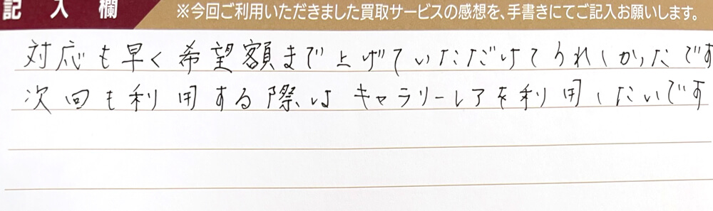 対応も早く希望額まで上げていただけてうれしかったです。 次回も利用する際はギャラリーレアを利用したいです。