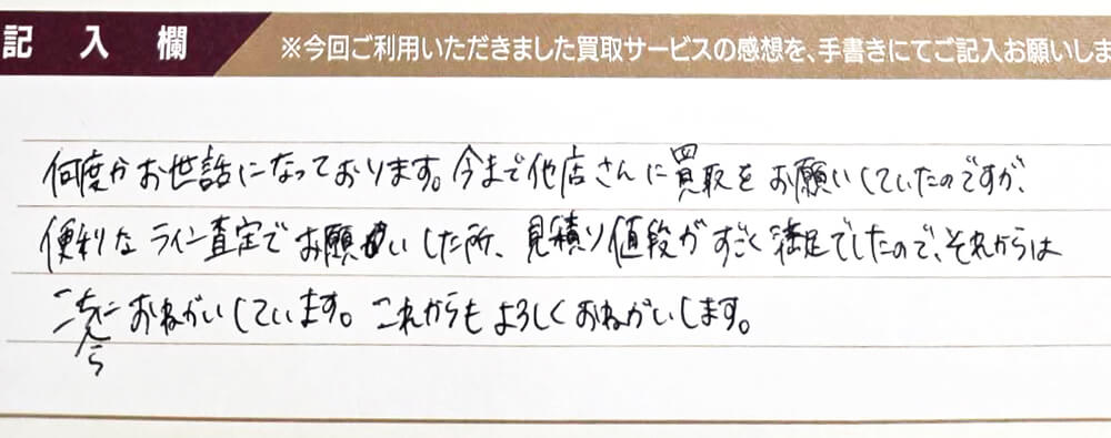 何度かお世話になっております。 今まで他店さんに買取をお願いしていたのですが、便利なライン査定でお願いした所、見積り値段がすごく満足でしたので、それからはこちらにお願いしています。 これからもよろしくおねがいします。