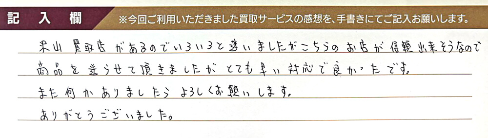 沢山買取店があるのでいろいろと迷いましたがこちらのお店が信頼出来そうなので商品を送らせて頂きましたがとても早い対応で良かったです。 また何かありましたらよろしくお願いします。 ありがとうございました。