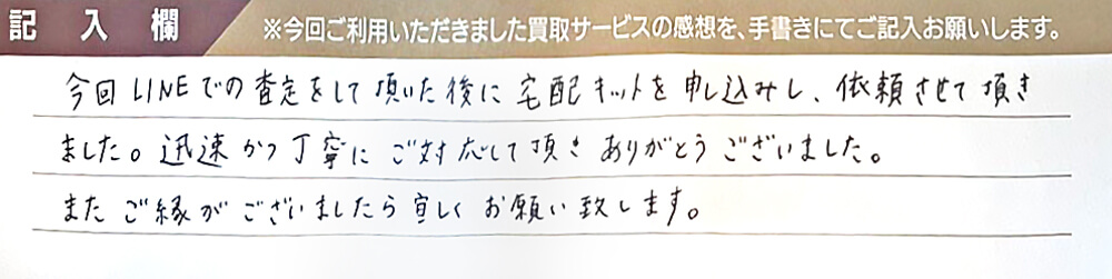 今回LINEでの査定をして頂いた後に宅配キットを申し込みし、依頼させて頂きました。 迅速かつ丁寧にご対応して頂きありがとうございました。 またご縁がございましたら宜しくお願い致します。