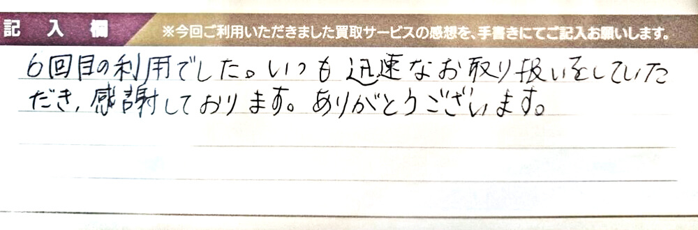 6回目の利用でした。 いつも迅速なお取り扱いをしていただき、感謝しております。 ありがとうございます。