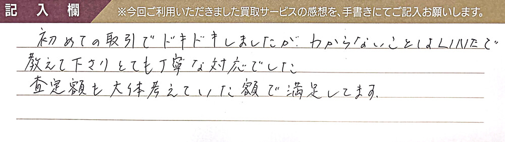 初めての取引でドキドキしましたが、わからないことはLINEで教えて下さりとても丁寧な対応でした。 査定額も大体考えていた額で満足してます。