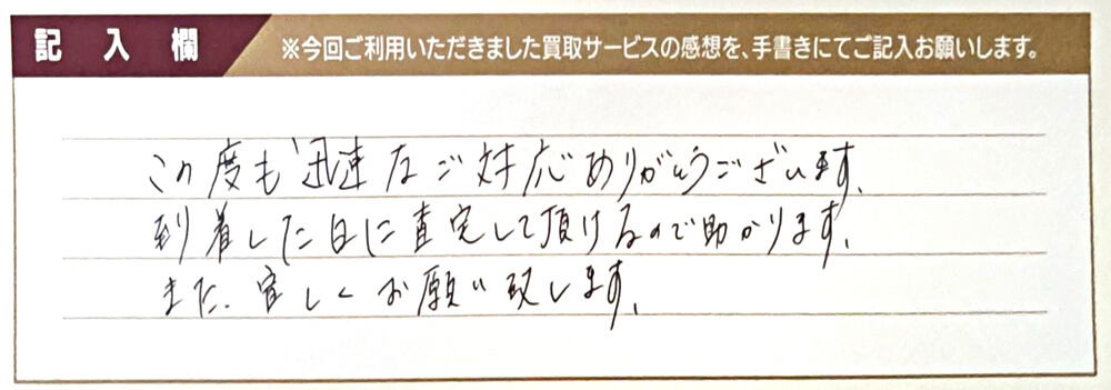 この度も迅速なご対応ありがとうございます。 到着した日に査定して頂けるので助かります。 また、宜しくお願い致します。