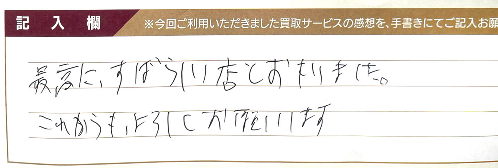 最高にすばらしい店とおもいました。 これからも、よろしくお願いします。