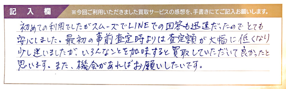 初めての利用でしたがスムーズでLINEでの回答も迅速だったのでとても安心しました。 最初の事前査定時よりは査定額が大幅に低くなり少し迷いましたが、いろんなことを加味すると買取していただいて良かったと思います。 また、機会があればお願いしたいです。