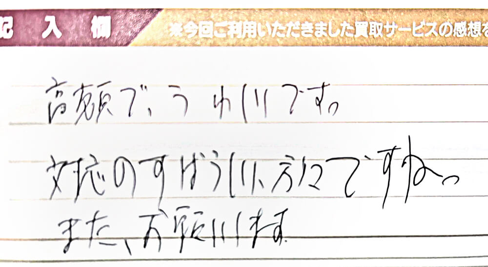 高額で、うれしいです。 対応のすばらしい、方々ですね。 また、お願いします。