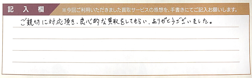 ご親切に対応頂き、良心的な買取をしてもらい、ありがとうございました。