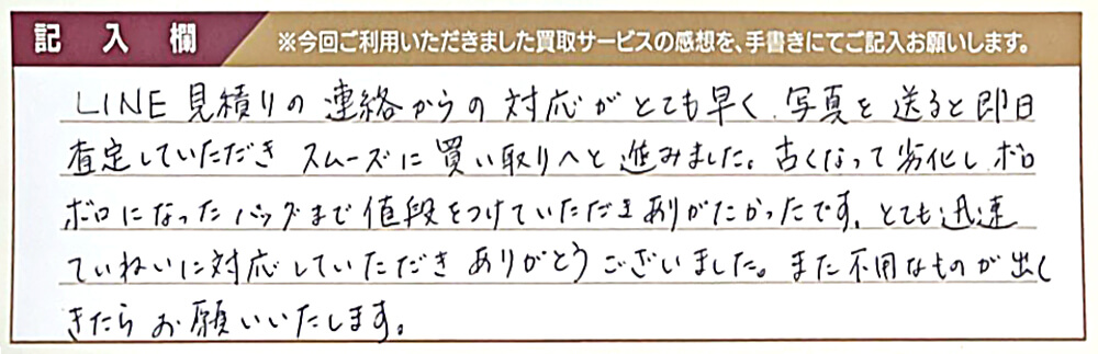 LINE見積りの連絡からの対応がとても早く、写真を送ると即日査定していただきスムーズに買い取りへと進みました。 古くなって劣化しボロボロになったバッグまで値段をつけていただきありがたかったです。 とても迅速ていねいに対応していただきありがとうございました。 また不用なものが出てきたらお願いいたします。