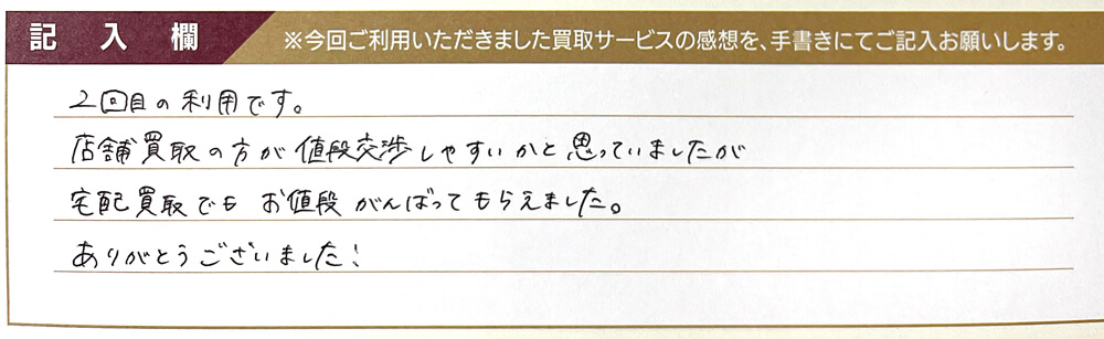 2回目の利用です。 店舗買取の方が値段交渉しやすいかと思っていましたが、宅配買取でもお値段がんばってもらえました。 ありがとうございました!