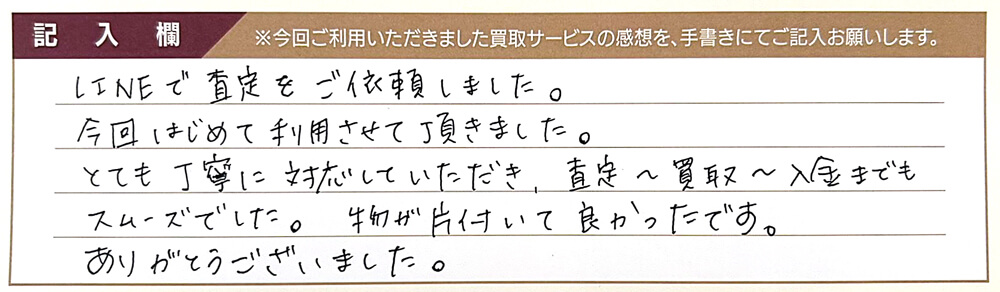 LINEで査定をご依頼しました。 今回はじめて利用させて頂きました。 とても丁寧に対応していただき、査定~買取~入金までもスムーズでした。 物が片付いて良かったです。 ありがとうございました。
