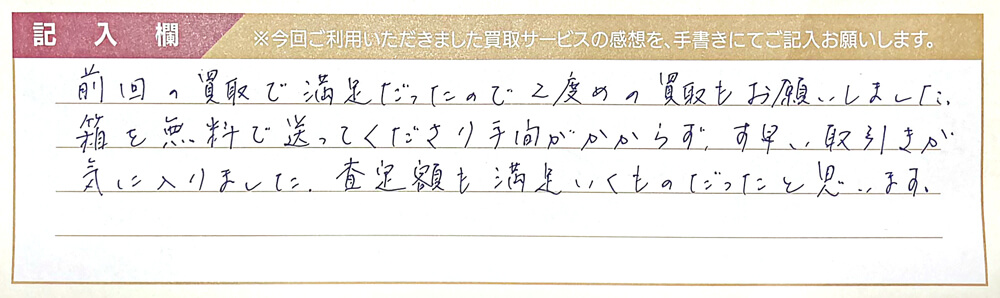 前回の買取で満足だったので2度めの買い取りもお願いしました。 箱を無料で送ってくださり手間がかからず、す早い取引が気に入りました。 査定額も満足いくものだったと思います。