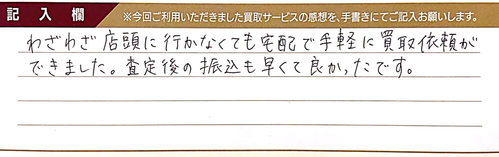 わざわざ店頭に行かなくても宅配で手軽に買取依頼ができました。 査定後の振込も早くて良かったです。