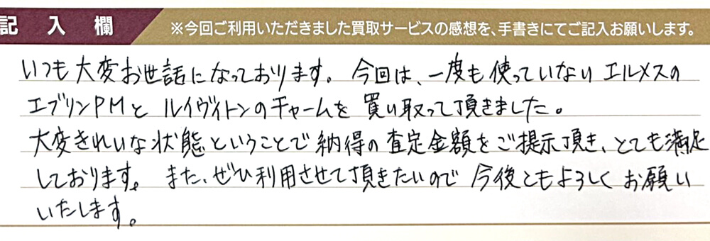いつも大変お世話になっております。 今回は、一度も使っていないエルメスのエブリンPMとルイヴィトンのチャームを買い取って頂きました。 大変きれいな状態ということで納得の査定金額をご提示頂き、とても満足しております。 また、ぜひ利用させて頂きたいので今後ともよろしくお願いいたします。