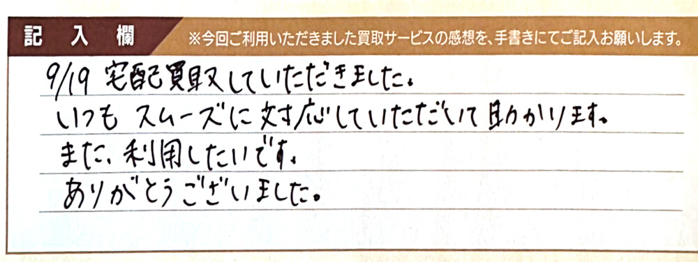 9/19宅配買取していただきました。 いつもスムーズに対応していただいて助かります。 また、利用したいです。 ありがとうございました。
