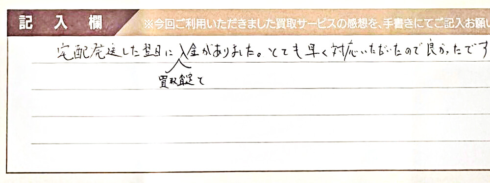 宅配発送した翌日に買取査定と入金がありました。 とても早く対応いただいたので良かったです。