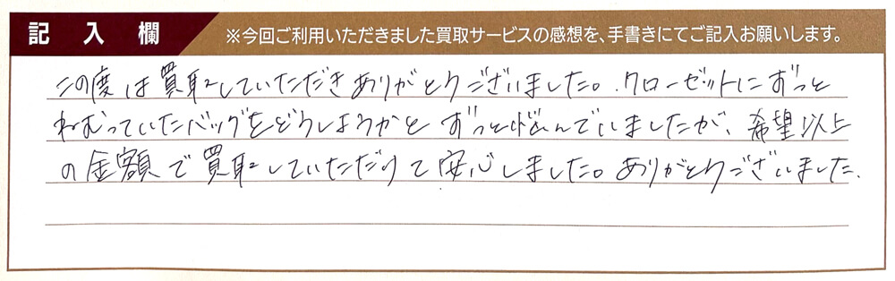 この度は買取していただきありがとうございました。 クローゼットにずっとねむっていたバッグをどうしようかとずっと悩んでいましたが、希望以上の金額で買取していただけて安心しました。 ありがとうございました。
