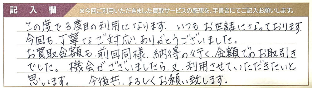 この度で3度目の利用になります。 いつもお世話になっております。 今回も丁寧なご対応ありがとうございました。 お買取金額も前回同様納得の行く金額でのお取引きでした。 機会がございましたら、又利用させていただきたいと思います。 今後共よろしくお願い致します。