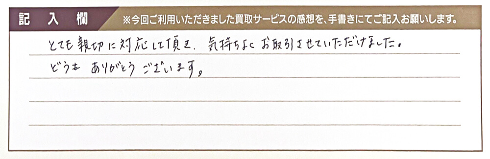 とても親切に対応して頂き、気持ちよくお取引きさせていただきました。 どうもありがとうございます。