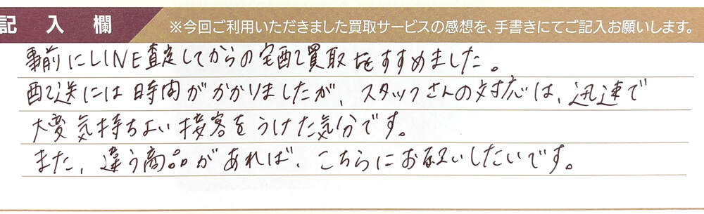 事前にLINE査定してからの宅配買取をすすめました。 配送には時間がかかりましたが、スタッフさんの対応は、迅速で大変気持ちよい接客を受けた気分です。 また、違う商品があれば、こちらにお願いしたいです。