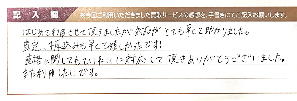 はじめて利用させて頂きましたが対応がとても早くて助かりました。 査定、振込みも早くて嬉しかったです! 連絡に関してもていねいに対応して頂きありがとうございました。 また利用したいです。