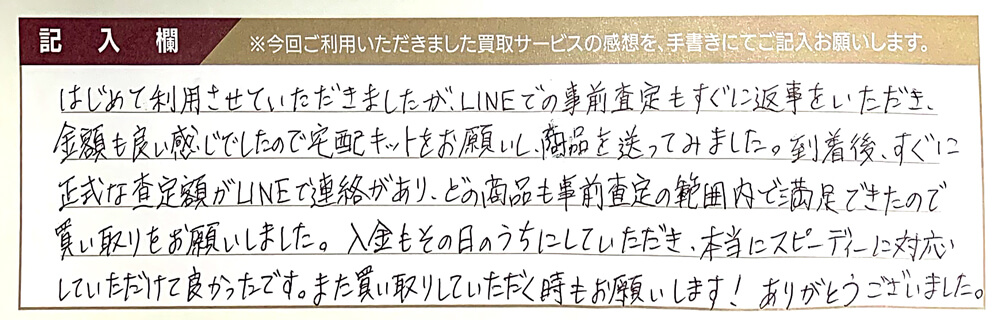 到着後、すぐに正式な査定額がLINEで連絡があり、どの商品も事前査定の範囲内で満足できたので買い取りをお願いしました。