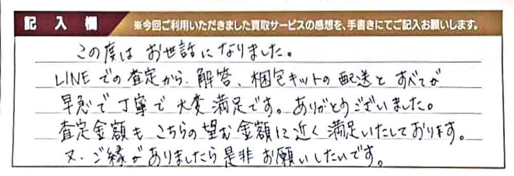 この度はお世話になりました。 LINEでの査定から、解答、梱包キットの配送とすべてが早急で丁寧で大変満足です。 ありがとうございました。 査定金額もこちらの望む金額に近く満足いたしております。 又、ご縁がありましたら是非お願いしたいです。