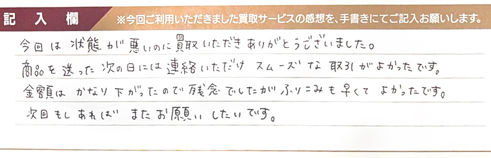 今回は状態が悪いのに買取いただきありがとうございました。 商品を送った次の日には連絡いただけスムーズな取引がよかったです。 金額はかなり下がったので残念でしたがふりこみも早くよかったです。 次回もしあればまたお願いたいです。
