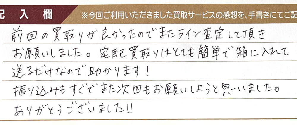 前回の買取りが良かったのでまたライン査定して頂きお願いしました。 宅配買取りはとても簡単で箱に入れて送るだけなので助かります。 振り込みもすぐでまた次回もお願いしようと思いました。 ありがとうございました!!