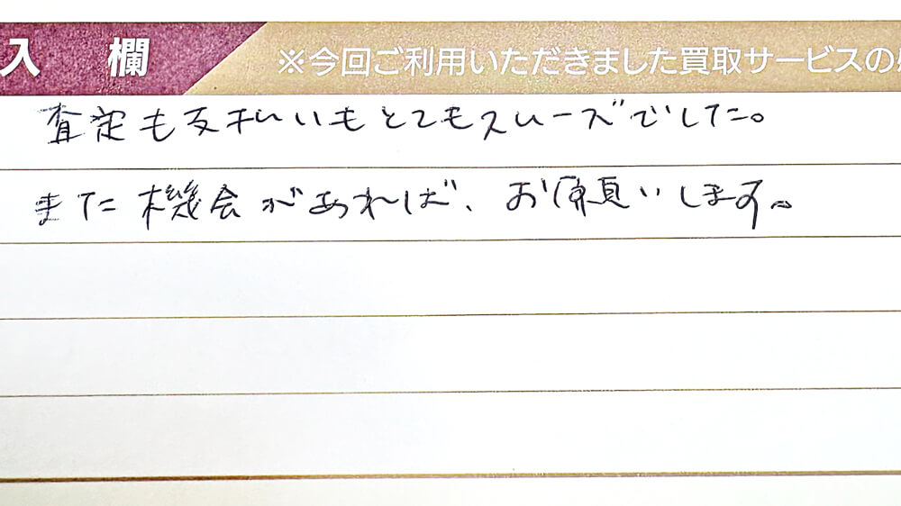 査定も支払いもとてもスムーズでした。 また機会があれば、お願いします。