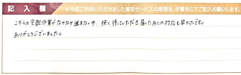 こちらの宅配作業がなかなか進まない中、快く待っていただき届いたあとの対応も早かったです。 ありがとうございました。