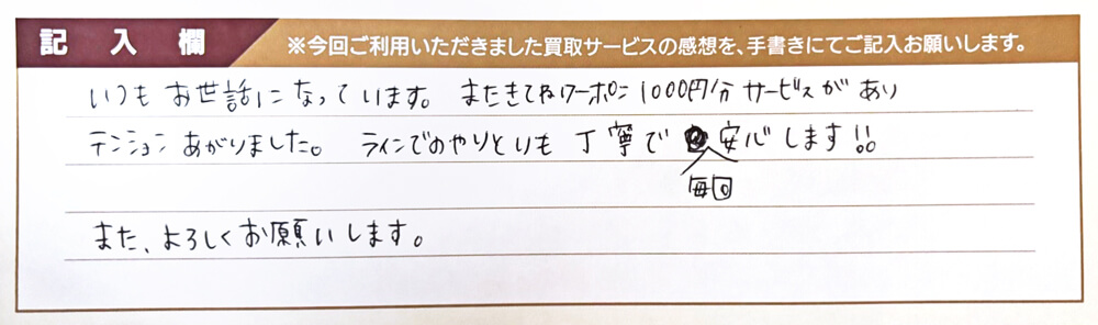 いつもお世話になっています。 またきてねクーポン1000円分サービスがありテンションあがりました。 ラインでのやりとりも丁寧で毎回安心します!! また、よろしくお願いします。