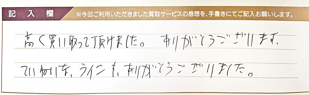 高く買い取って頂けました。 ありがとうございます。 ていねいなラインもありがとうございました。