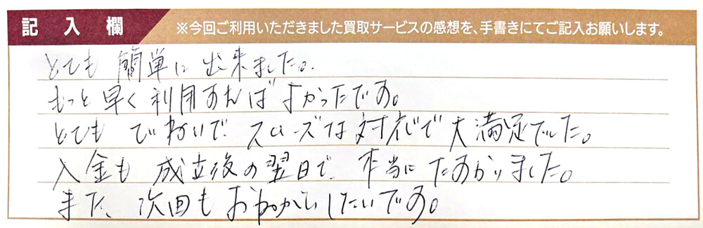 とても簡単に出来ました。 もっと早く利用すればよかったです。 とてもていねいで、スムーズな対応で大満足でした。 入金も成立後の翌日で、本当にたすかりました。 また次回もおねがいしたいです。