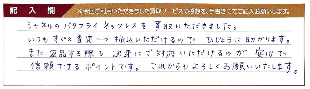 シャネルのバタフライネックレスを買取いただきました。 いつもすぐの査定→振込いただけるのでひじょうに助かります。 また返品する際も迅速にご対応いただけるのが安心で信頼できるポイントです。 これからもよろしくお願いいたします。