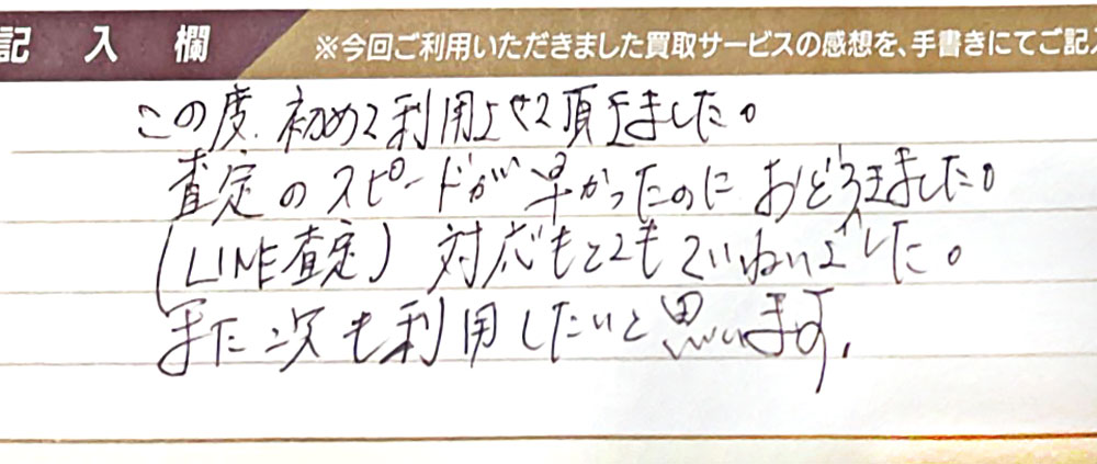 この度、初めて利用させていただきました。 査定のスピードが早かったのにおどろきました。 (LINE査定)対応もとてもていねいでした。 また次も利用したいと思います。