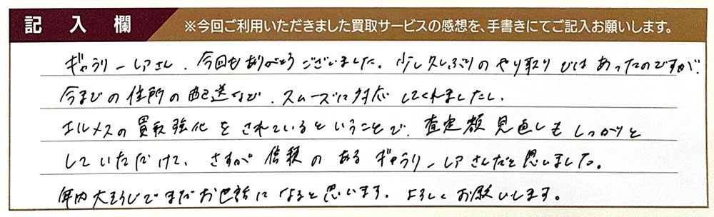 少し久しぶりのやり取りではあったのですが、今までの住所の配送など、スムーズに対応してくれましたし、エルメスの買取強化をされているということで、査定額見直しもしっかりとしていただけて、さすが信頼のあるギャラリーレアさんだと思いました。