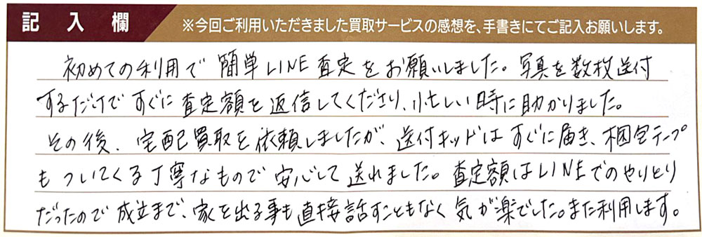 その後、宅配買取を依頼しましたが送付キットはすぐに届き、梱包テープもついてくる丁寧なもので安心して送れました。